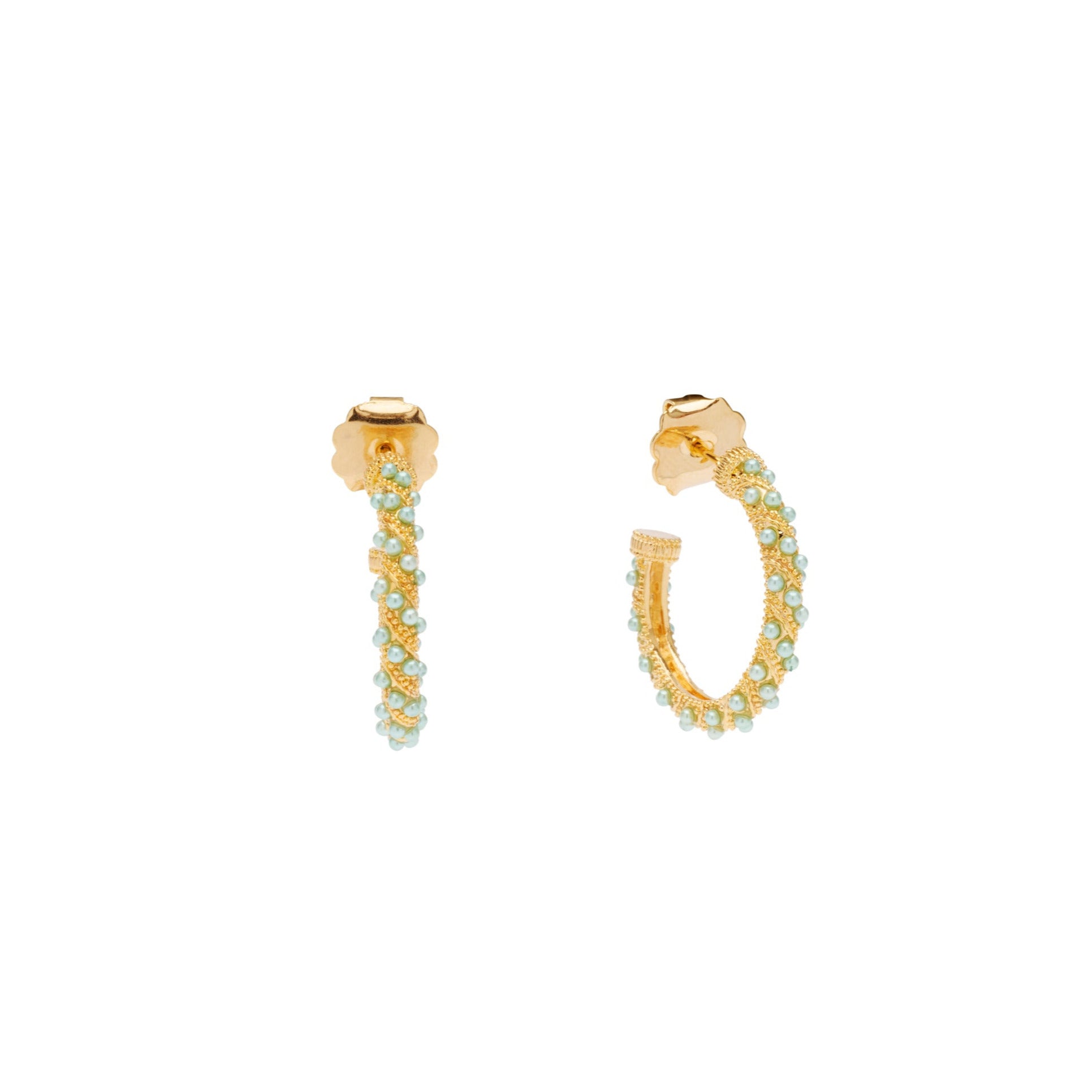 Vi bruger ferskvandsperler, som er skabt og produceret ved hjælp af mennesker. Der indpodes væv eller en plastikkugle i ferskvandsmuslingen for at irritere den. Muslingen forsøger herefter at komme af med irritationen ved at isolere muslingen i et lag af perlemor og herved danne ferskvandsperlen. Denne proces kan tage op til 2-3 år eller længere. Anvendes bl.a. i Aubree Hoops, Aline Earring og Desiree Earring.