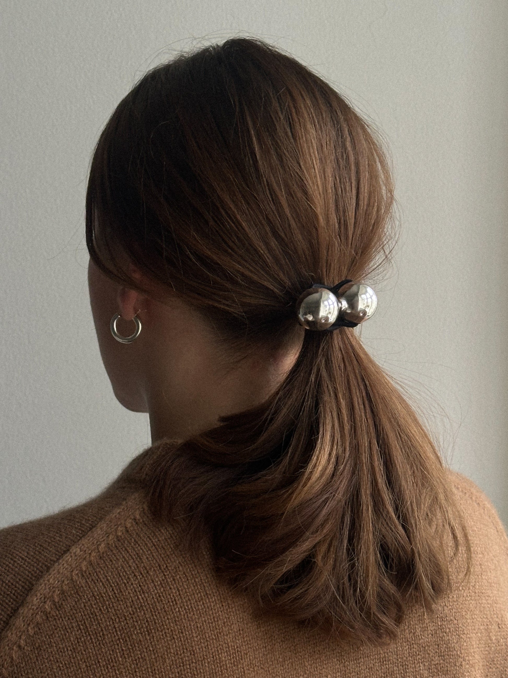 Tilføj et strejf af kant til din hestehale med Amina-elastikken. Med to dristige metalkugler i guld- eller sølvtoner er den den perfekte blanding af enkelhed og statement.