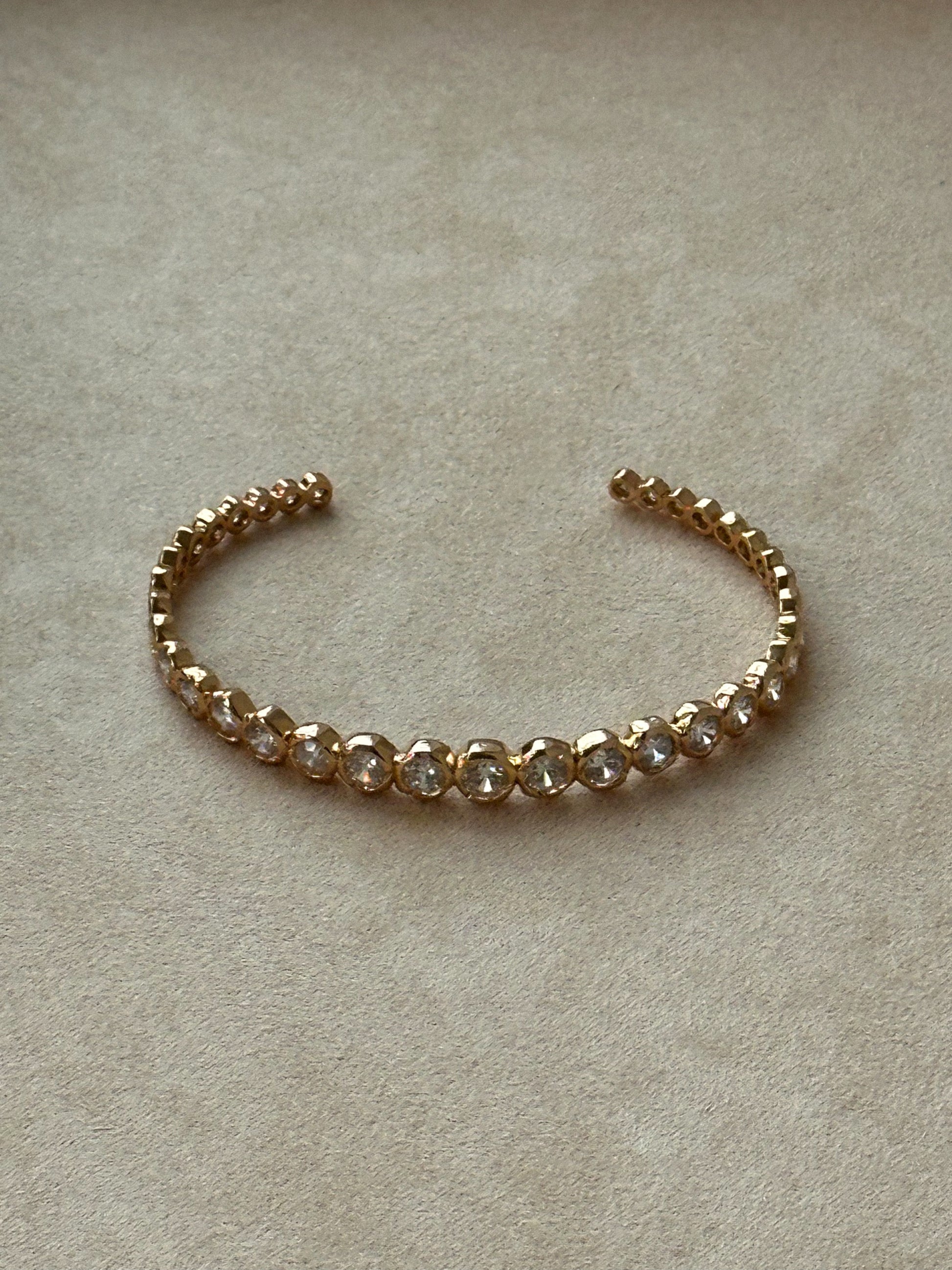 Dette smukke armbånd er udsmykket med blændende krystaller, der fanger lyset smukt og giver dit look et fængslende skær.