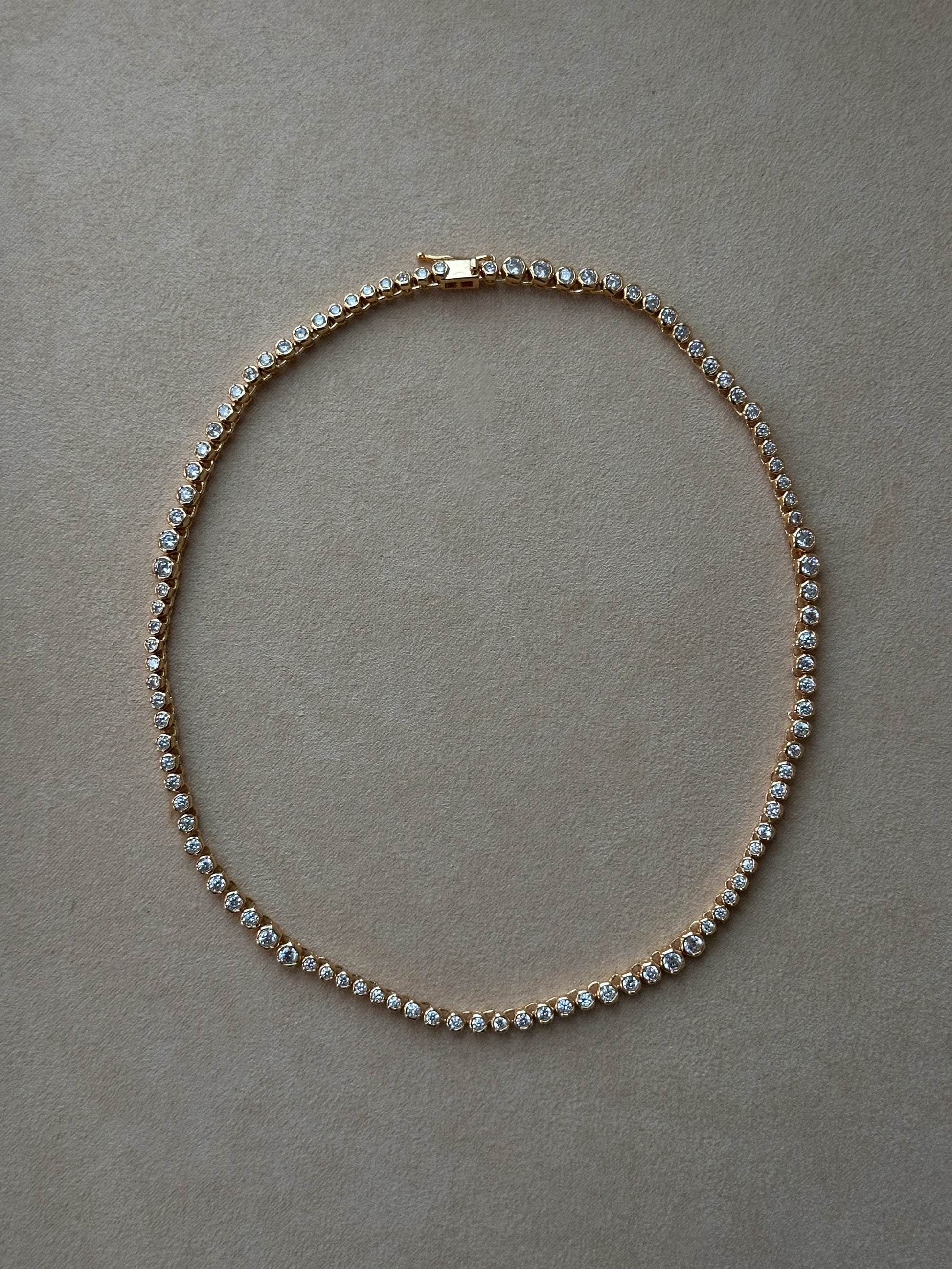 Denne smukke halskæde er udsmykket med blændende krystaller, der fanger lyset smukt og giver dit look et fængslende skær.