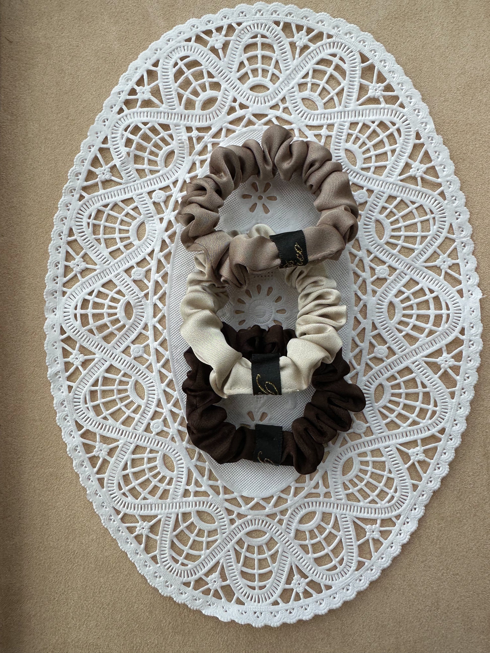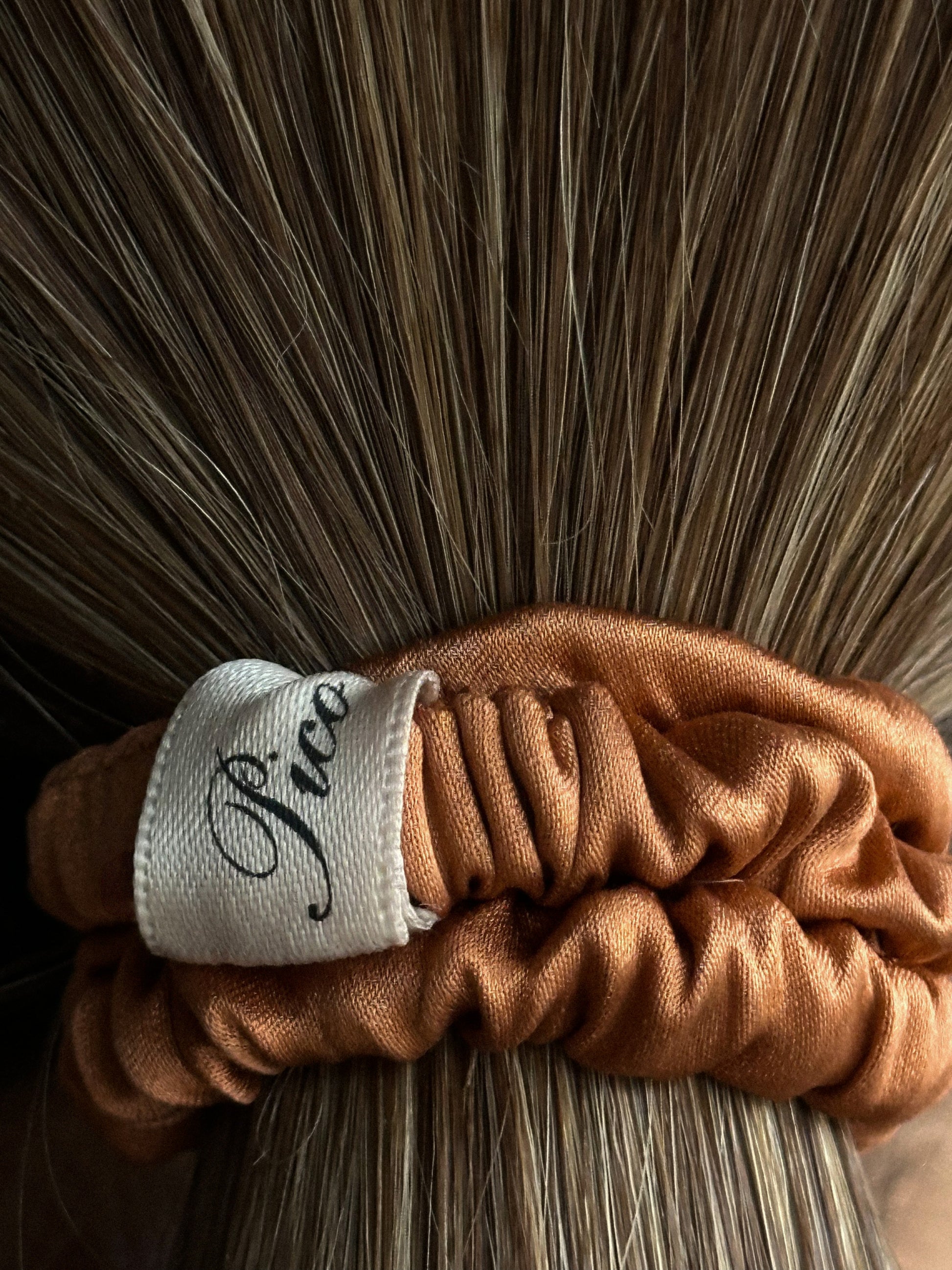 En tyndere version af vores klassiske Cali-scrunchie. Håndlavet i satinstof. En uundværlig detalje til dit hår hver dag.