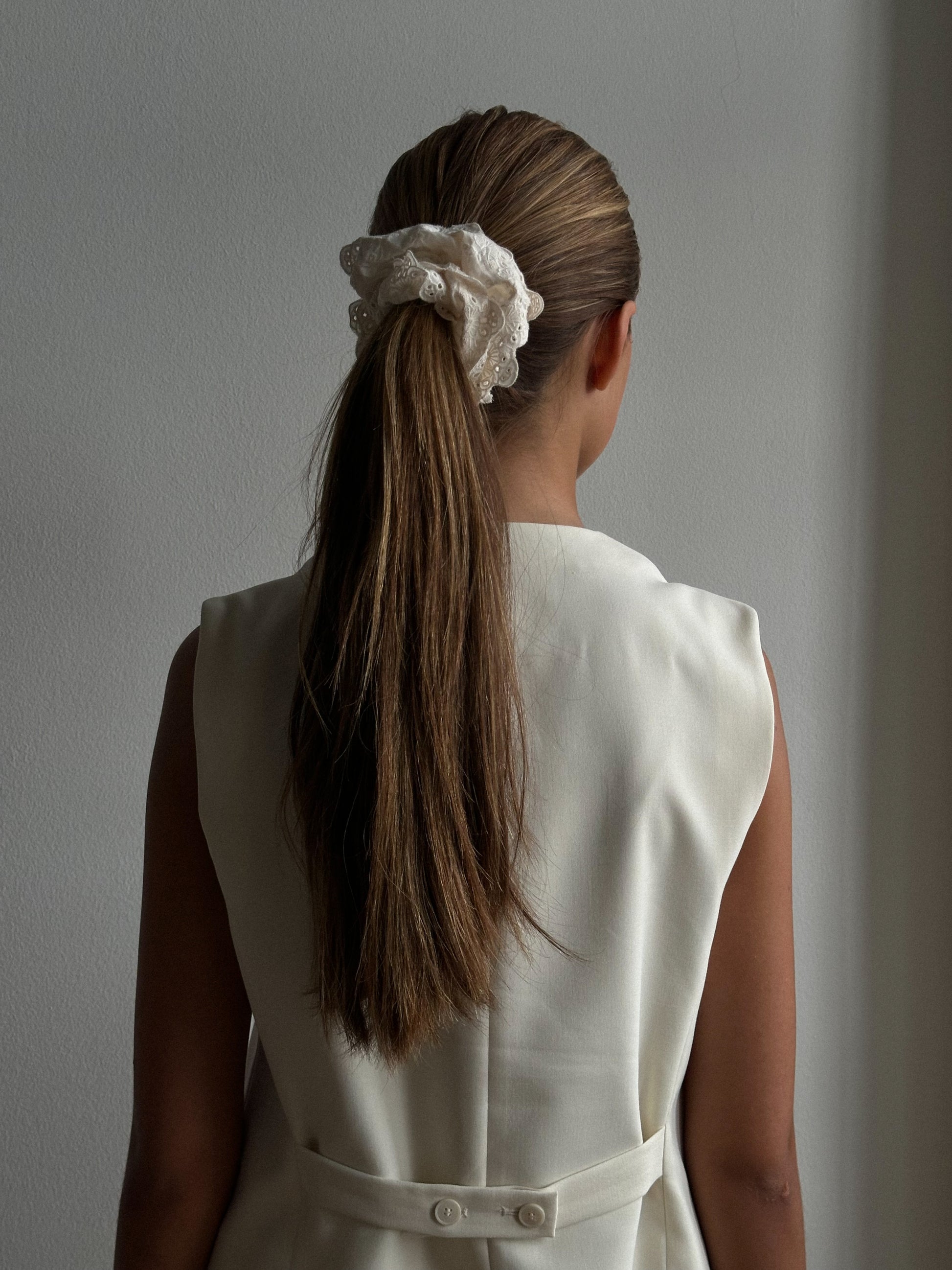 Vi præsenterer vores Lace Scrunchie - en finurlig blanding af stil og komfort, der tilføjer et strejf af romantik til enhver frisure. Denne scrunchie er lavet af delikate blonder og giver et unikt twist på en klassisk accessory