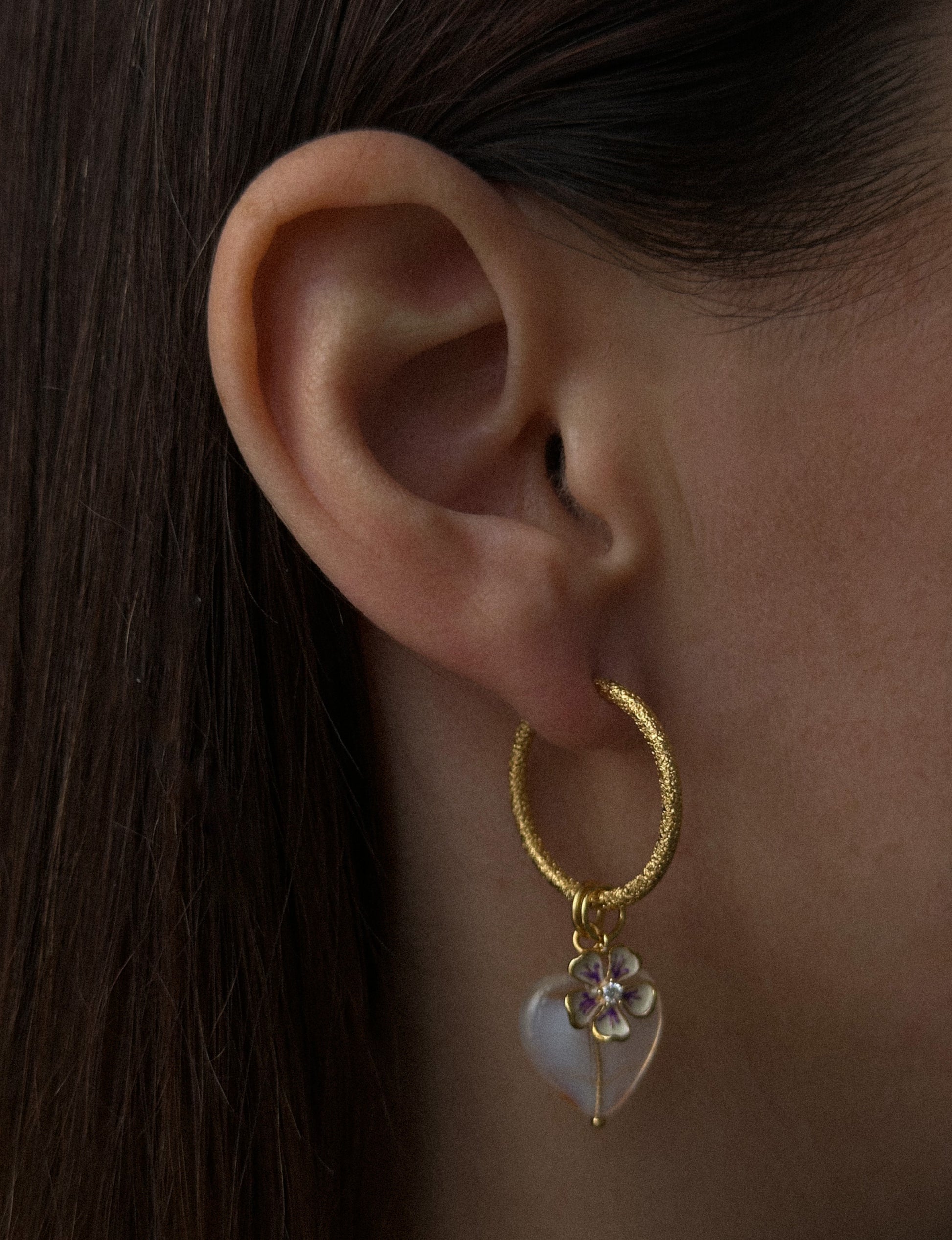 Vi bruger ferskvandsperler, som er skabt og produceret ved hjælp af mennesker. Der indpodes væv eller en plastikkugle i ferskvandsmuslingen for at irritere den. Muslingen forsøger herefter at komme af med irritationen ved at isolere muslingen i et lag af perlemor og herved danne ferskvandsperlen. Denne proces kan tage op til 2-3 år eller længere. Anvendes bl.a. i Aubree Hoops, Aline Earring og Desiree Earring.